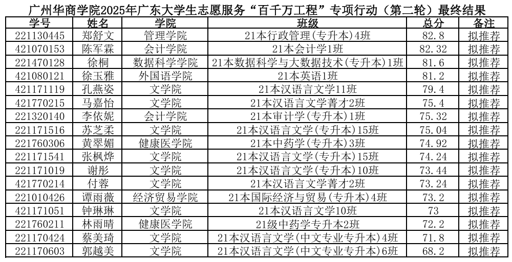为深入学习贯彻党的二十大精神、二十届三中全会精神,积极响应国家发展战略,鼓励我校学子深入基层、投身西部,根据《关于印发<2025-2026年度大学生志愿服务西部计划实施方案>的通知》相关要求,落实广东省项目办相关工作安排,学校团委坚持公开、公平、公正的原则,经个人申报、资格审核、学院推荐、笔试、面试等环节,现将威廉希尔williamhill中文2025年志愿服务“百千万工程”专项行动(第二轮)结果予以公示: