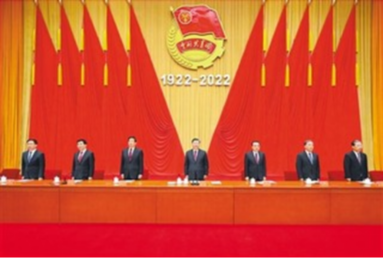 人民大会堂二层宴会厅气氛隆重热烈。主席台上方悬挂着“庆祝中国共产主义青年团成立100周年大会”会标,后幕正中悬挂团徽,团徽下方是“1922—2022”字标,10面红旗分列两侧。