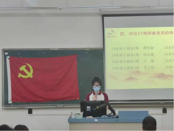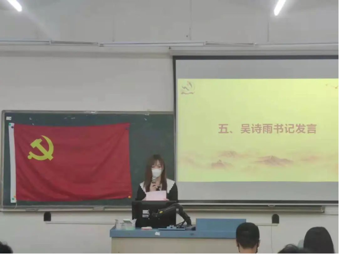 大会第五项为吴诗雨老师发言。吴诗雨老师首先对按期转为正式党员的同志们给予肯定和表示祝贺,她希望新党员能够更加严格要求自身,做好党员的模范带头作用。对此,她提出三点期望与要求:一是不断增强入党的光荣感和责任感,坚定对党的理想信念,永葆正确的政治方向;二是要始终以党员的标准规范要求自己,不但在组织上入党,还要在思想上入党,做一名真正合格的共产党员;三是在学习生活乃至未来步入工作岗位中,以身作则,率先垂范,起先锋模范作用。她表示每一位共产党员都应该跟上新形势,树立新观念,展现新姿态,用实际行动,艰苦奋斗,砥砺前行。