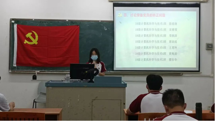 大会第三项为介绍党支部概况。数据科学学院学生第一党支部(原信息工程系学生党支部),2019年10月因基层党组织设置调整,更名为数据科学学院党支部;2020年04月因基层党组织设置调整,更名为数据科学学院学生第一党支部,主要负责学院计算机科学与技术专业学生党员的培养、发展、教育与考察工作。目前在校党员61名,其中正式党员27名,预备党员34名。
