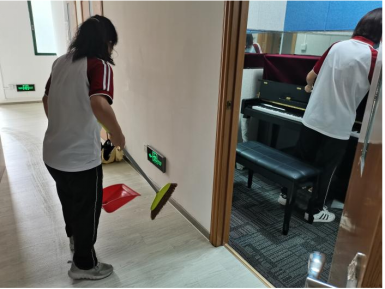 在第二期5名志愿者清扫厚德楼一楼C111的舞蹈室,3名志愿者清扫厚德楼二楼A208的钢琴室。