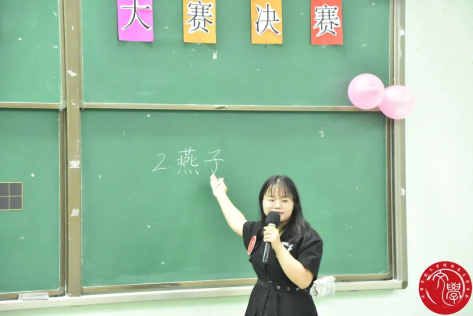 经过初赛和复赛的层层挑战,有六位选手脱颖而出,他们分别是廖思茹、陈舒婷、曾昭莹、任静、杨仪、林壬涛。比赛正式开始,第一位选手是来自19级汉语言文学专升本8班的廖思茹同学,她授课的内容是部编版三年级下册第二课《燕子》。廖思茹同学以饱满的精神和自信的表现以及一手漂亮的板书为在座的各位呈现《燕子》这篇课文,为这场比赛开了个好头。