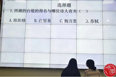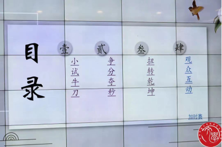 紧张刺激的比赛结束后,是观众互动环节。本环节的题型为填空题,以看故事说成语为主,由观众进行抢答。抢答开始前,同学们紧盯大屏幕,当一个个经典的成语故事出现在大屏幕时,观众们反应迅速,积极抢答。