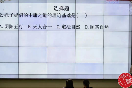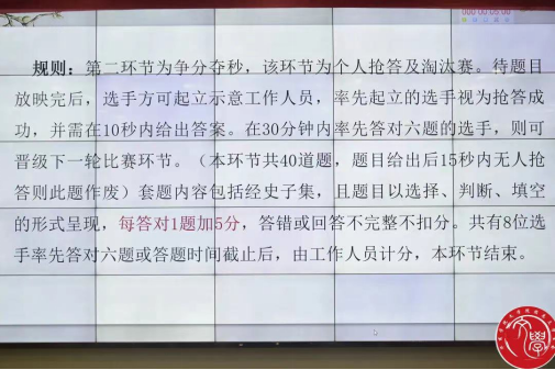 本环节采用小组轮答的形式进行,各小组在五组套题中选择自己心仪的套题依次作答,在五分钟内完成各自选择的套题,答对一题得五分。本环节题目通过选择和判断的形式呈现,在答题过程中,选手不断输出自己对国学知识的积淀,并在答题过程中完善自己的知识漏洞,在场观众也进一步加深了对经史子集内容的了解。各位选手在开场环节还略显紧张,但随着赛事的推进,选手们也逐渐展露锋芒、跃跃欲试。