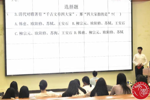 最终,张明中老师为本次比赛作总结。首先,老师认为这是一场十分精彩的比赛,对同学们丰富的知识储备表示赞许。其次,老师还指出同学们的不足,认为同学们在对文学作品的作者以及词牌名的认识等方面有待加强。他对于同学们关于历史性方面的题目的作答情况表示十分满意,尤其点出1号选手陈柔伊同学的正答率十分突出。最后,老师表明,本次比赛是一场知识与游戏相结合的比赛,与死记硬背相比反而更能将知识融会贯通,希望学习部能多举办类似的活动来增强同学们对国学知识的认识和学习。