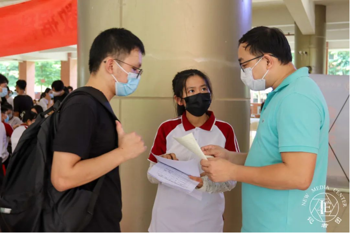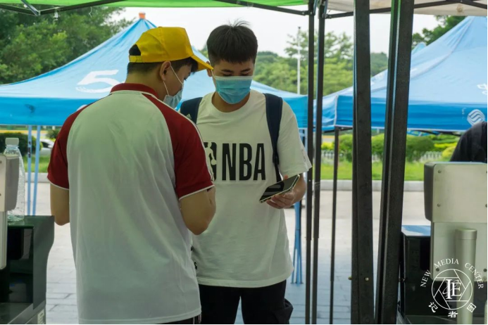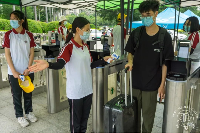 在校门口,每位志愿者肩负起了守门的重任,为落实疫情防控相关措施,校门处的每一位志愿者在引导新生出示健康码和行程卡的同时为新生测量体温。