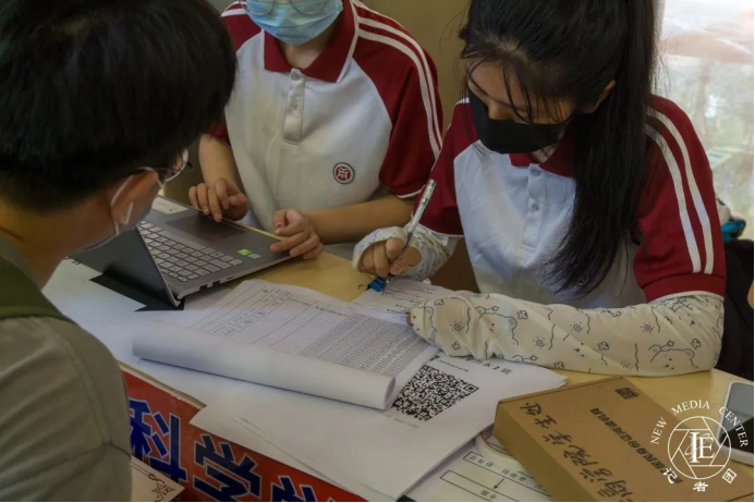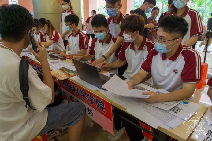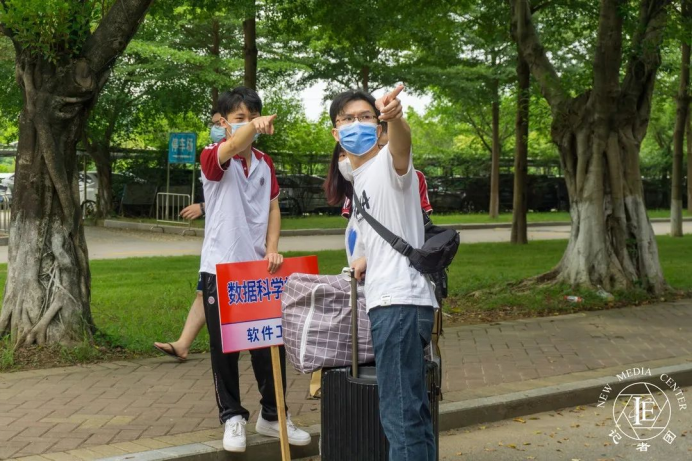新生入校后,负责引导新生入校的志愿者们耐心地为新生们讲解学校的相关事项,为新生们发放学校地图,并指引新生前往启智楼报到。