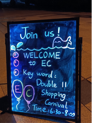 外研部本学期的第二次活动顺利开展。外国语学院学生会外研部于11月15日晚上6点半到8点在图书馆旁边举行了面向我校全体师生的日常活动——Double Eleven Shopping Carnival。活动中,同学们相互交流,分享购物过程中的独特体验、探讨网络购物的利与弊、推荐好物。