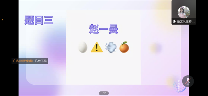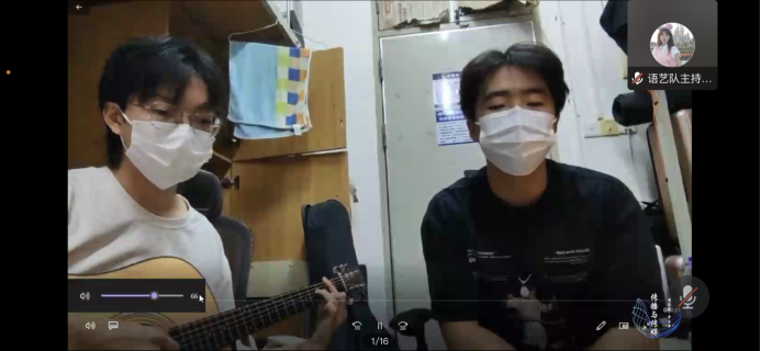 大会进入下一环节,由21级动画1班黄嘉豪和姚俊吉同学带来的《告白气球》,悠扬的歌声伴随着吉他的旋律,满满少年活力涌上屏幕。
