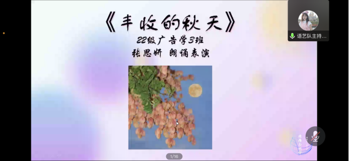 大会进入第三项议程,由22级广告学3班张思妍同学带来的朗诵《丰收的秋天》。她声情并茂的语句,仿佛带领我们穿梭秋季,让观众深切感受到自然的神奇和生命的美好。
