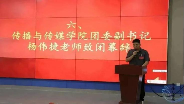 传播与传媒学院团委副书记杨伟捷老师致闭幕辞。他提到,传播与传媒学院学生会和广大青年学生干部一直在思考如何更好地开展工作,一年来他们紧紧围绕着“新时代”去组织理论学习、社会实践、文体活动等,取得了较好的成绩和结果。同时,青年们要深刻把握历史新方位和时代新特点,明大势、识大局、知大任,踊跃融入推进伟大斗争、伟大工程、伟大事业、伟大梦想的磅礴征程,满怀信心地为夺取新时代中国特色社会主义伟大胜利而奋斗。