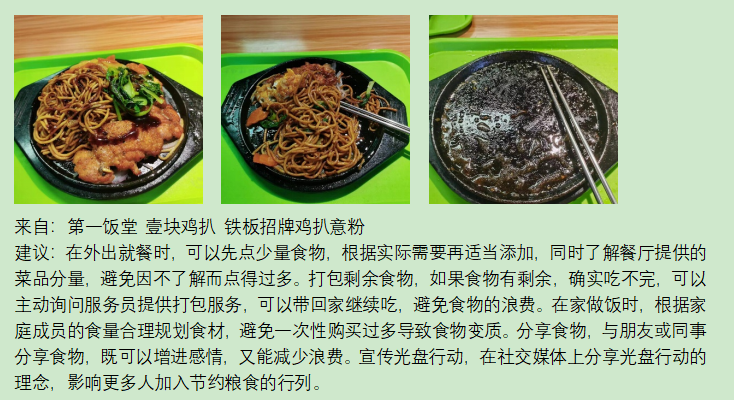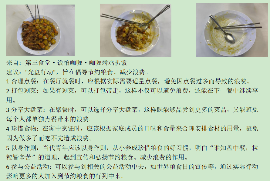 此次活动得到同学们的积极响应,各个食堂建立了践行光盘行动的良好风气。餐前,同学们精心挑选自己喜爱的菜品,合理估量所需分量,做到不盲目多打食物。餐中,大家细细品味美食,同时也更加深刻地体会到每一粒粮食都凝聚着农民的辛勤汗水和大自然的宝贵馈赠。餐后,一张张“光盘”照片见证了同学们的节约之举,这不仅是对自己的一种约束,更是对粮食的敬重和对劳动的尊重。同学们在品味美食之际,不忘拍照分享,线上晒出的“光盘”照片,以及交流的合理建议,充分彰显出同学们对节约粮食的敬重与担当。