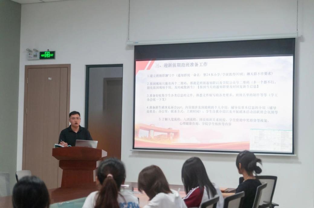 会上,徐炯锋老师就新生入学日常教育、服务、管理工作向全体助理班主任强调要提高站位,做好新生的引路人。徐老师还就迎新前期准备工作进行了工作部署,叮嘱助理班主任们全心投入,助力新生顺利完成报到手续。