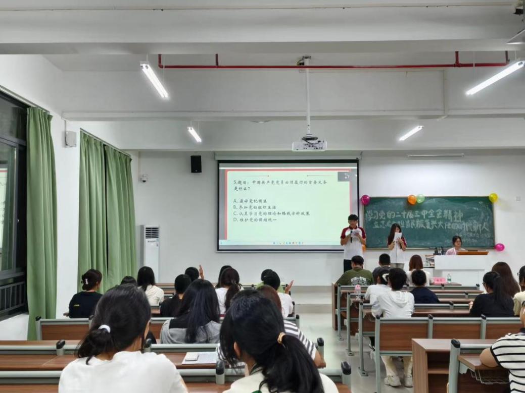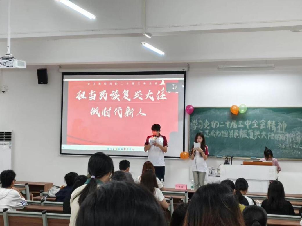 党的二十届三中全会科学谋划围绕推进中国式现代化进一步全面深化改革的总体部署,彰显了以威廉希尔williamhill中文同志为核心的党中央将改革进行到底的坚强决心和强烈使命担当。这次全会在新征程上高高举起改革开放伟大旗帜,坚定不移走中国式现代化道路,具有继往开来的里程碑意义。党的二十届三中全会顺利召开,审议通过了《中共中央关于进一步全面深化改革、推进中国式现代化的决定》,为我们指明了前进方向,提供了根本遵循。在要求下,外国语学院团委于9月24日19:30,在肇庆校区16号楼208教室举办以“学习贯彻党的二十届三中全会精神,立志成为担当民族复兴大任的时代新人”为主题的九月团生总结大会。活动对象为外国语学院大一至大三全体学生。