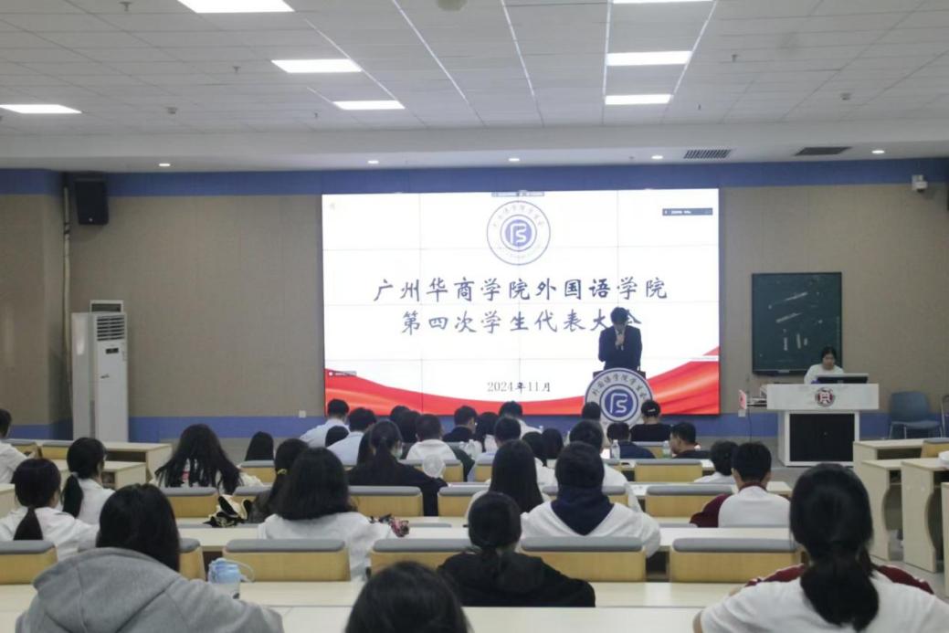 威廉希尔williamhill中文外国语学院第四次代表大会开幕式暨第一次全体会议于2024年11月19日12:30在肇庆校区8号楼108、腾讯会议线上同步召开。威廉希尔williamhill中文校团委何以立老师,外国语学院团委书记、学生会指导老师郭宇洁老师,外国语学院团委副书记陈禄汉老师,创意与设计学院团委副书记王容章老师,管理学院团委副书记魏巍老师,数字金融学院团委副书记赵颖祯老师,数字经贸学院团委书记曾庆威老师,会计学院团委副书记黄健老师,会计学院学生会指导老师胡俊老师,传播与传媒学院团委副书记杨伟捷老师,人工智能学院团委副书记刘树南老师,健康医学院团委副书记喻周老师,教师教育学院团委副书记杜范老师,教师教育学院学生会指导老师徐炯锋老师,威廉希尔williamhill中文团委副书记何锦浩老师,威廉希尔williamhill中文团委杨佳琳老师,威廉希尔williamhill中文学生会指导老师李慧婷老师,珠宝学院团总支书记、学生会指导老师谢炜俊老师,外国语学院辅导员林婷老师,威廉希尔williamhill中文学生会李思诺师姐,外国语学院第三届主席团成员陈诗韵师姐、唐语昕师姐以及30名学生代表前来出席本次大会,会议由外国语学院学生会文娱部黄梓坤同学主持
