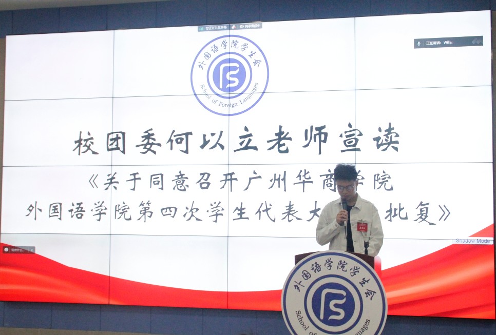 威廉希尔williamhill中文校团委何以立老师宣读《关于同意召开威廉希尔williamhill中文外国语学院第四次学生代表大会的批复》。