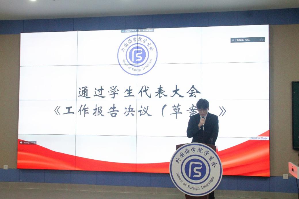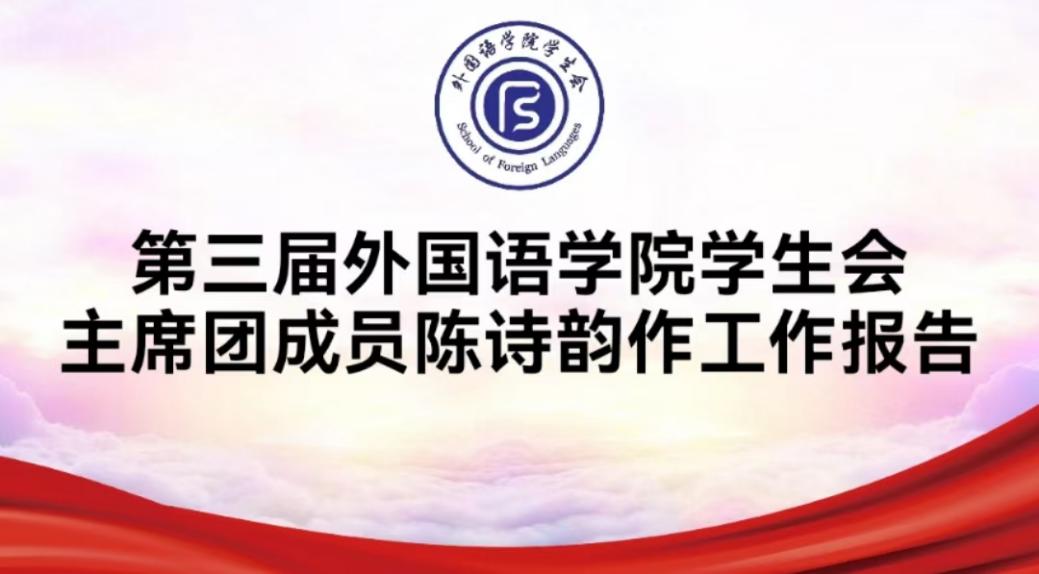 ——第三届外国语学院学生会主席团成员陈诗韵作工作报告。报告总结了我院学生会上一年的工作情况,在给予肯定的同时提出仍有待改进的不足。希望全体工作人员有则改进、无则加勉,坚持贯彻为同学服务的宗旨,充分发挥好学生会与同学间沟通的纽带作用。