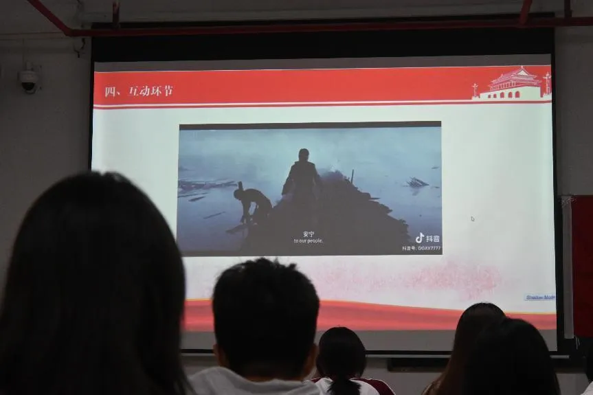 在“看片段猜电影”互动游戏中,同学们通过团队协作,辨认影片《八佰》、《金刚川》等爱国主义题材电影的片段。这一环节寓教于乐,不仅增进了同学们之间的默契与协作能力,还让大家在轻松的氛围中深入了解了影片所传递的爱国情怀。