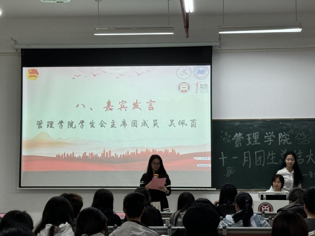 颁奖环节过后,由管理学院学生会主席团成员吴佩茵上台发言,为本月的团生活动做出总结,鼓励同学们立志做有理想、敢担当、能吃苦、肯奋斗的新时代好青年。