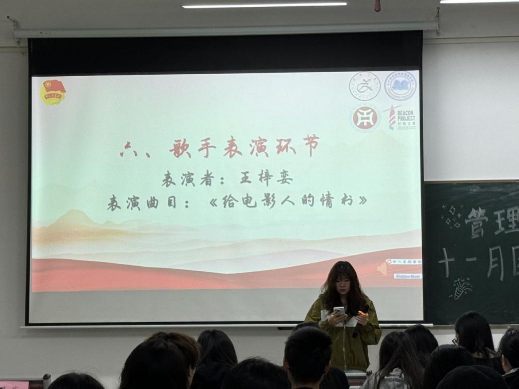 游戏结束后,由歌手王梓娈同学为我们带来一首感人的《给电影人的情书》, 她的歌声蕴含着无尽的热情和执着,感染了在场每一位同学,同时也给每一位同学带来了力量,尽管生活总是充满了不确定性和挑战,同学们还是要笑对人生。