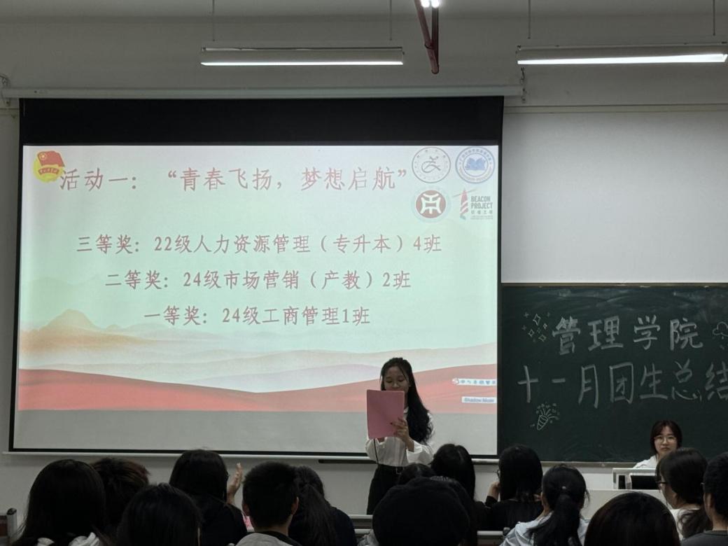 管理学院团委于11月21日晚上7时,在肇庆校区8号楼308教室举办主题为“青春逐梦正当时,奋楫杨帆期未来”十一月团组织生活总结大会,广州校区采用线上直播的形式同时举行。