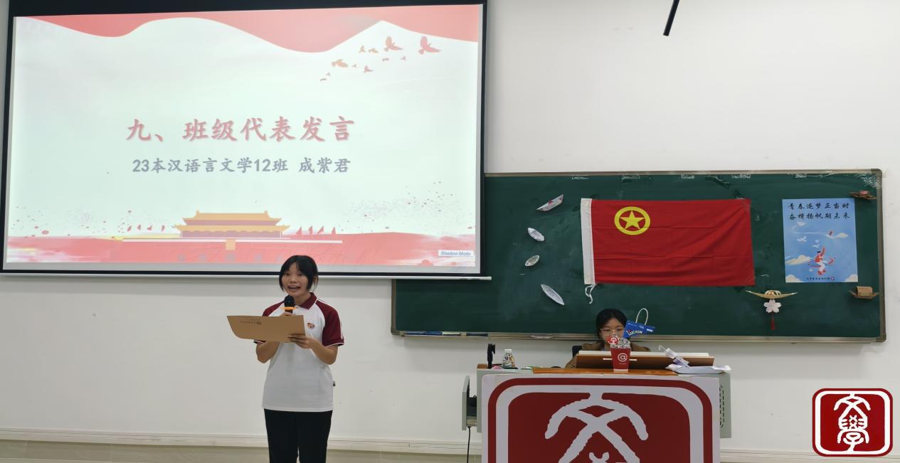 会议第九项议程,班级代表发言,成紫君同学表明青春正当时,吾辈当勇敢追梦。