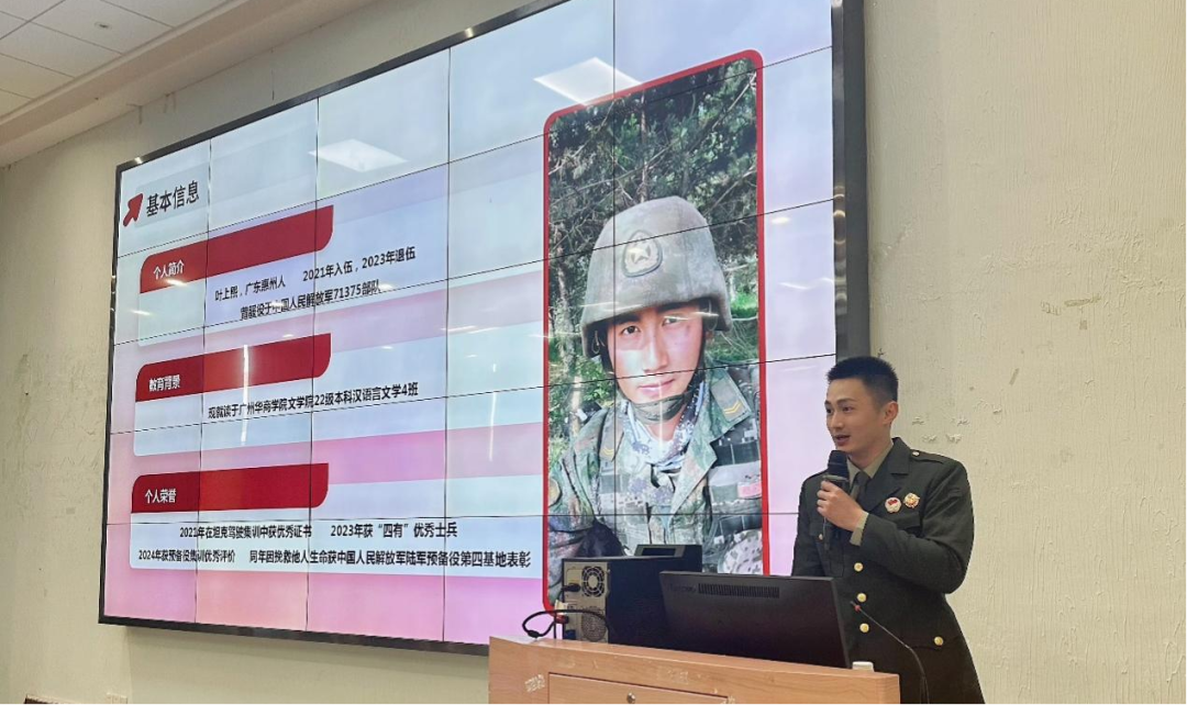 主讲人叶上熙,身为威廉希尔williamhill中文 22级本科汉语言文学4班的退伍大学生,履历颇丰。2021 年在坦克驾驶集训中荣获优秀证书,2023年获评“四有”优秀士兵,2024 年于预备役集训获优秀评价,且同年因英勇救人获得中国人民解放军陆军预备役第四基地表彰。