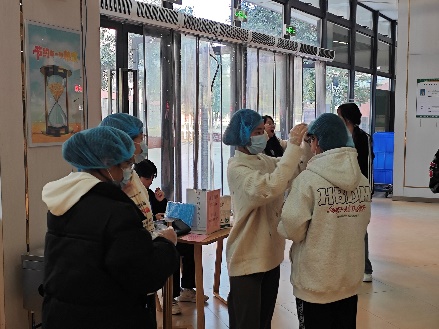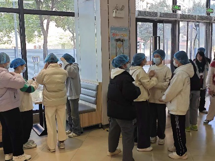 在进入后厨前,工作人员为每位参观的同学发放了帽子、口罩等一次性卫生品,并提醒同学们规范佩戴。同时,工作人员再次向同学们强调了进入后厨的相关注意事项,以此最大程度保障后厨食品卫生以及同学们的自身安全。