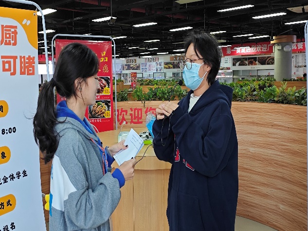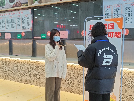 在参观结束之后,膳委会的工作人员对本次参观后厨的同学进行了采访。同学们均表示后厨环境干净整洁,食品摆放有序,同时,他们也结合亲身体验踊跃建言,提出如增加菜品种类、提高菜品的口味等建议。食堂管理人全程认真倾听,并承诺对合理建议进行采纳和改进。