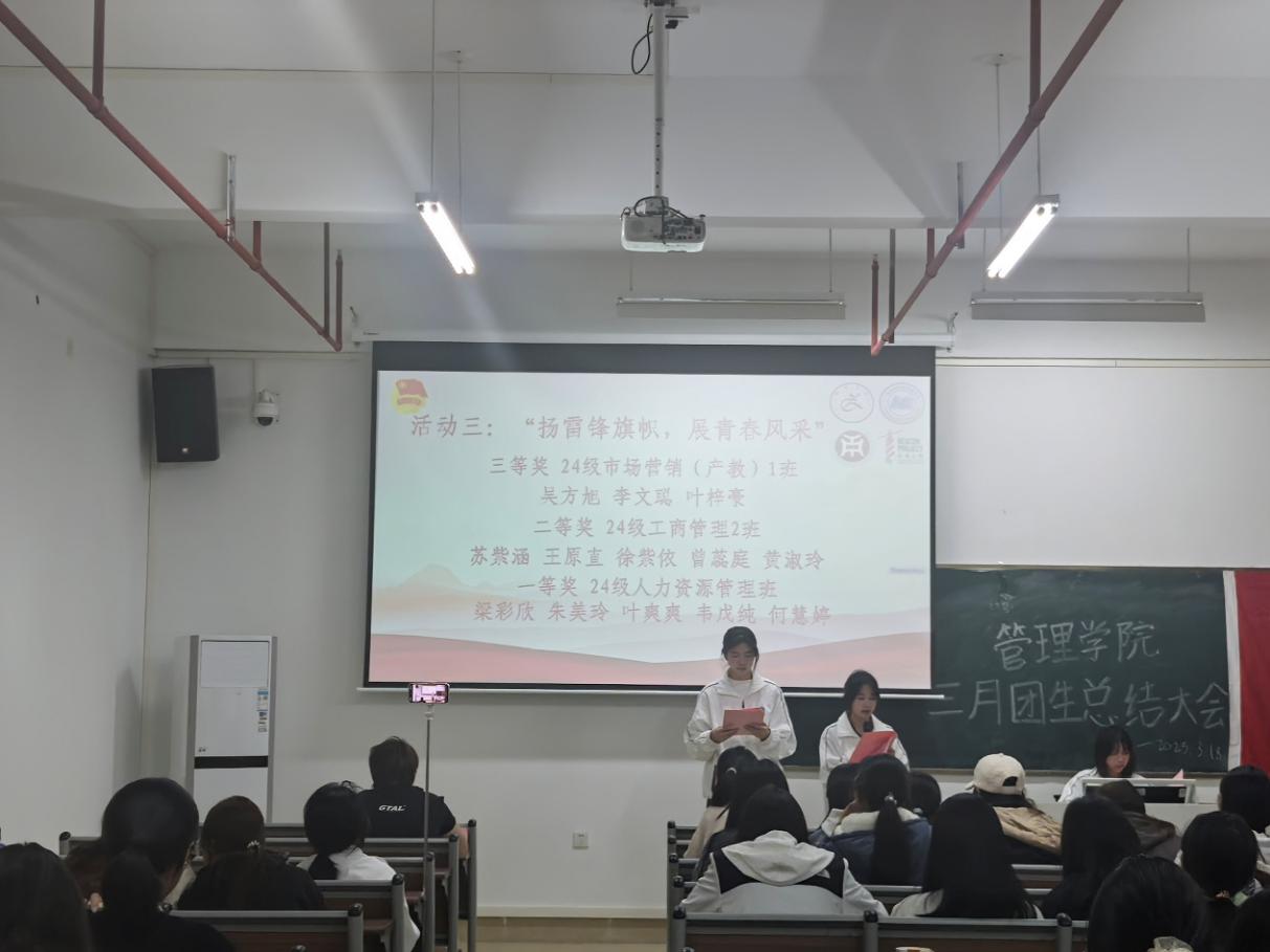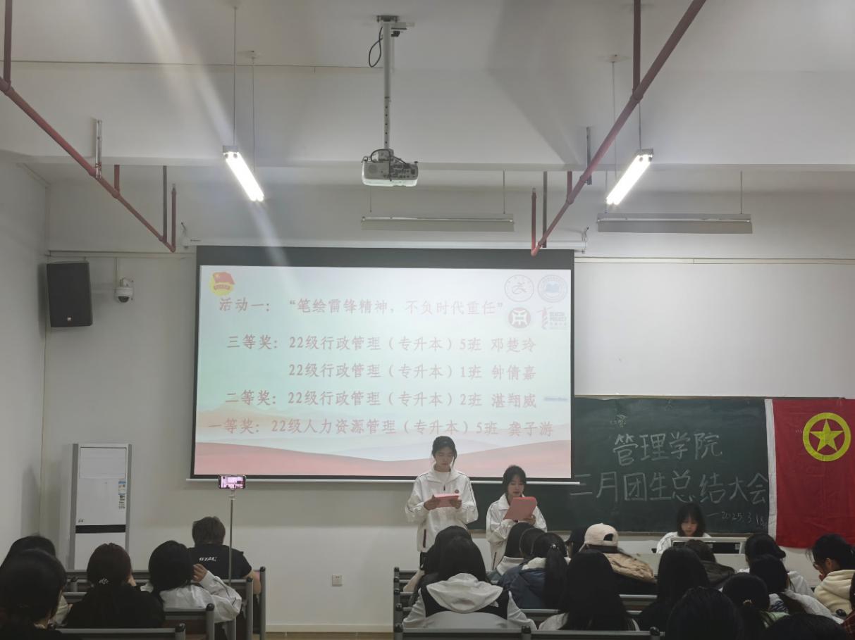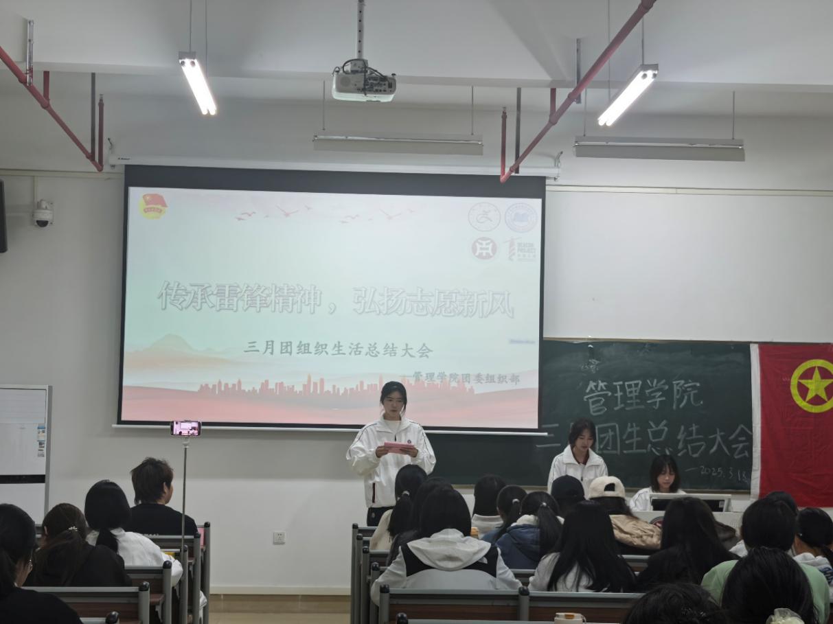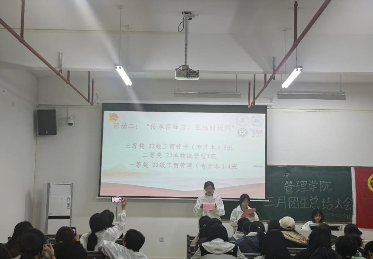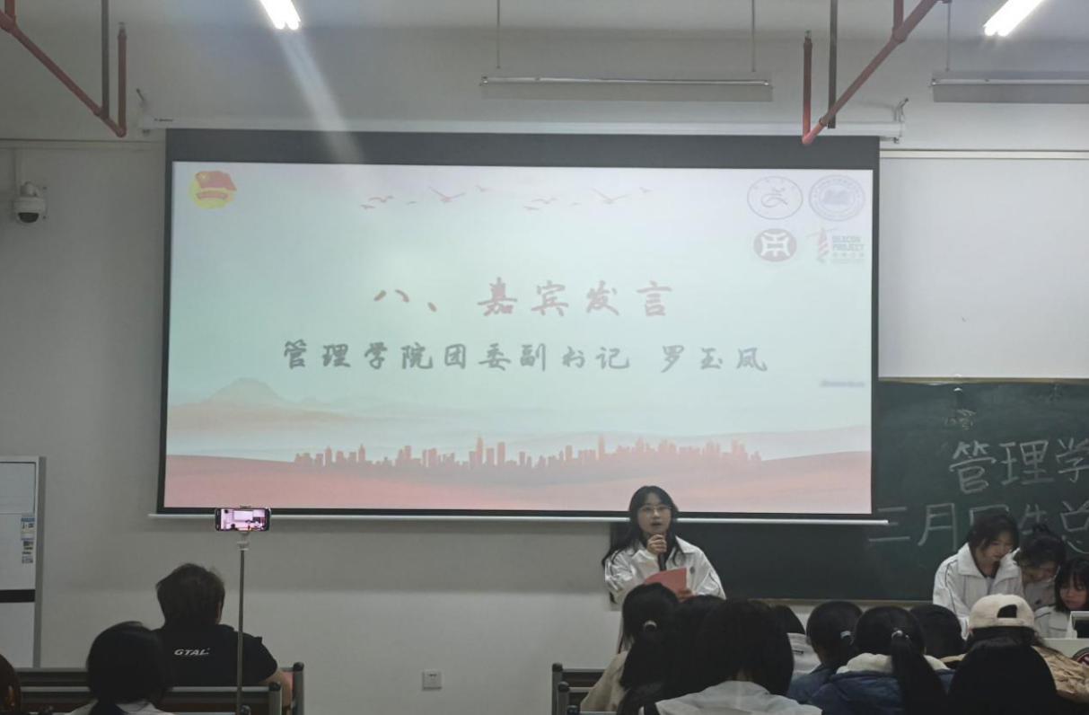 令人振奋的颁奖环节过后,由管理学院团委组织部关颖盈同学代管理学院团委副书记罗玉凤老师发言,为本月的团生活动做出总结,号召同学们传承雷锋精神,弘扬志愿新风,将雷锋的无私奉献与助人为乐化作日常行动!