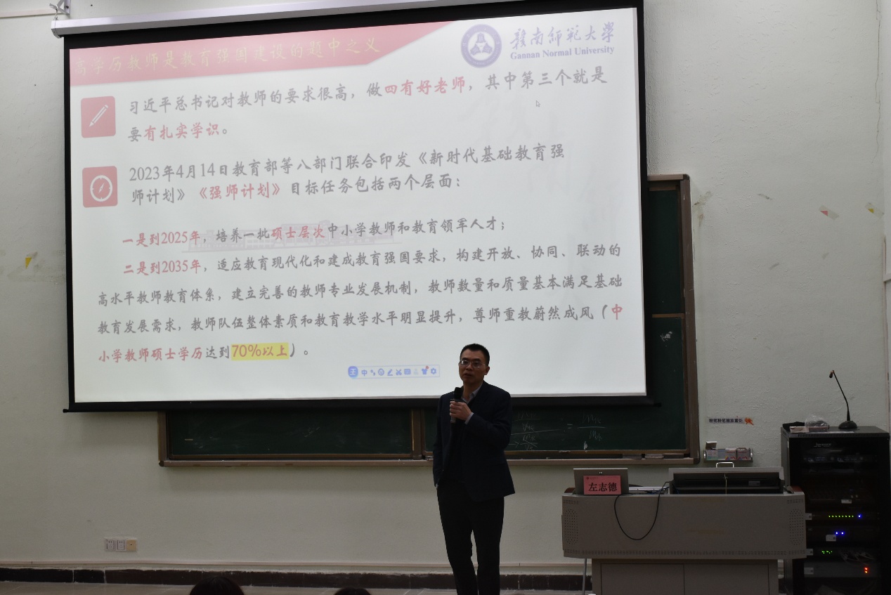 左志德教授在致辞中强调了高学历教师在教育强国建设中的重要性。他指出,威廉希尔williamhill中文总书记对教师提出了“四有好老师”的要求,其中扎实的学识是关键之一。左教授还提到,随着社会的发展和教育政策的推动,高学历已成为社会文明进步的重要特质,也是个人成长的重要工具。在AI时代,高阶思维更为重要,教师需要不断提升学历和专业素养,以应对教育生的变化。