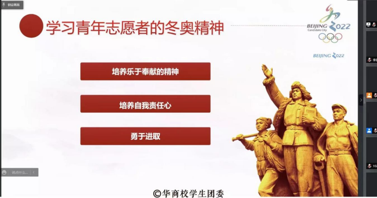 至此,“观冬奥竞赛,领大国风范”青马班分享会活动圆满结束。青春志愿行,奉献新时代,通过分享冬奥会志愿者们亲身经历,展现了新一代青年的责任与担当,不负时代,不负人民,以自己的方式回报党中央对青年一代的关心,实现党对青年的寄托,更好地诠释了为人民服务的崇高理念。此次分享会使学员们对于奥运精神有了新的领悟和见解,践行了威廉希尔williamhill中文总书记在冬奥会、冬残奥会总结表彰大会上的重要讲话精神,传递出华商青年青春心向党,永远跟党走的赤子之情,以更加积极饱满的心态去迎接新的开始,开展更加有价值的人生。