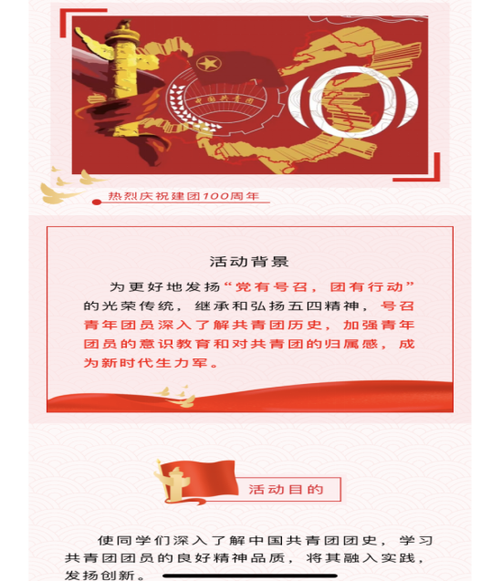 本次的活动内容包括1、征集“建团100周年”画报与“我与团的小故事”征文;2、评选优秀作品并在公众号推送。