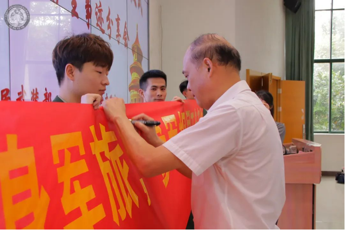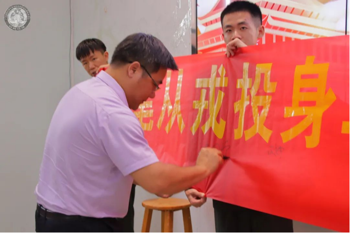 第三环节为学校领导致辞。首先,苏宁书记对出席大会的领导、嘉宾和师生们表示热烈的欢迎。对一直以来指导、支持我校征兵工作的增城区人民武装部和有关单位表示衷心的感谢。我校历来高度重视征兵工作,始终坚持以威廉希尔williamhill中文强军思想为指导,深入贯彻落实威廉希尔williamhill中文总书记关于加强和改进兵役工作重要指示批示精神,突出学校主阵地和大学生的征集主体,强化爱国主义教育,弘扬崇军尚武精神。他表示,国无防不立,民无兵不安,号召华商学子们携笔从戎投身国防,在强军兴军中彰显人生的价值。最后,他强调,征兵工作责任重大,使命光荣,我们一定要以高度负责的态度,务实求真的精神,全力做好本次的征兵工作,努力营造良好的征兵氛围,以更优异的成绩迎接党的二十大的胜利召开。