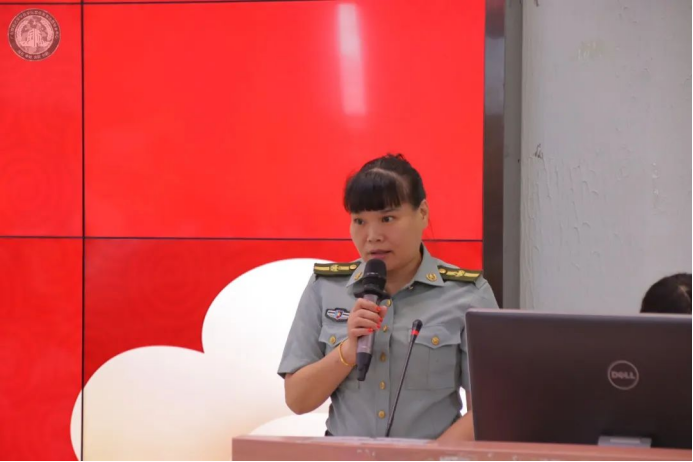 第四环节为增城区人武部致辞及征兵政策解读。增城区征兵办秘书组组长伍彩乐代表增城区人武部发言。她先是详细地为我们介绍了一系列征兵优惠政策,并着重强调为什么要去当兵,表示当兵是件光荣的事情,是为了保家卫国,没有国就没有家。并告诉我们,通过两年的军旅生活,我们个人精神状态、人生观念都会有巨大变化。最后,她也发出了希望同学们能积极报名参军,为国防事业出一份力的心愿。