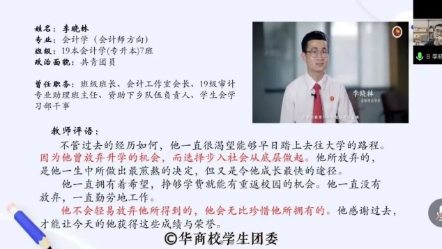 参与此次校内评审的9位候选人依次讲述了各自在学习、生活和社会实践中的经历,展示出了他们在拼搏奋斗中所获得的优异成绩,展示了华商青年开拓进取、笃行实干的精神风貌,发挥出了当代优秀青年大学生先进典型的示范引领作用。