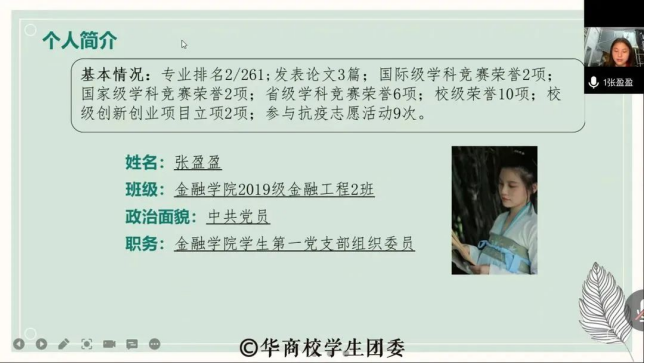 经过学生自主报名,校团委资格审查、初评以及校内评议等一系列程序,最终推选2019级金融工程专业张盈盈同学为我校2021年度“中国电信奖学金”奖学金报送人选。