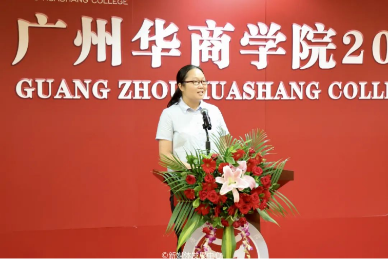 典礼第七项为教师代表杨莉云发言。教师代表杨莉云老师向毕业生们表示祝贺,总结同学们在校四年的青春修炼。她希望同学们未来依旧能牢记并秉持华商校训,在毕业之后继续加强三观建设,让“爱国、敬业、诚信、友善”刻在心中,将自己的梦想与中国梦结合,去创造属于自己的新天地!她更希望同学们可以常回家看看,热爱母校,关心母校发展。