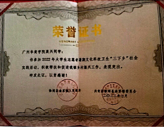 高兴同学暑期共参加了两个队伍的社会实践,分别在湛江市徐闻县以及四会市石狗镇开展半个多月的暑期“三下乡”社会实践活动。在经济、文化、政治宣传、学术调研等方面高质量完成任务,获得包括新华社、人民日报、共青团中央等十余家官方和省级以上的媒体专题报道,并被徐闻县委政府表彰嘉奖。