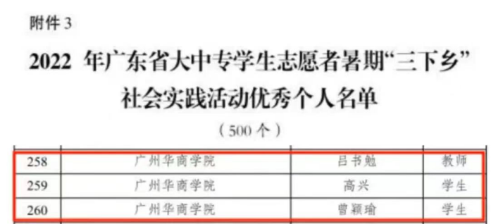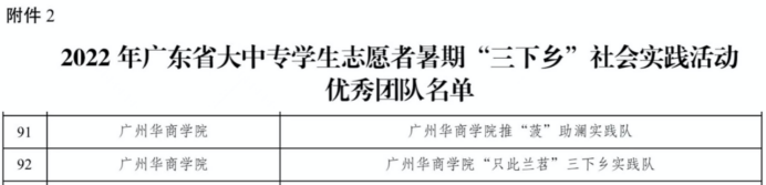 在广东省大中专学生志愿者暑期文化科技卫生“三下乡”社会实践评审活动中,我校推“菠”助澜实践队与“只此兰苕”三下乡实践队被评为优秀团队,吕书勉老师、高兴同学、曾颖瑜同学被评为优秀个人。