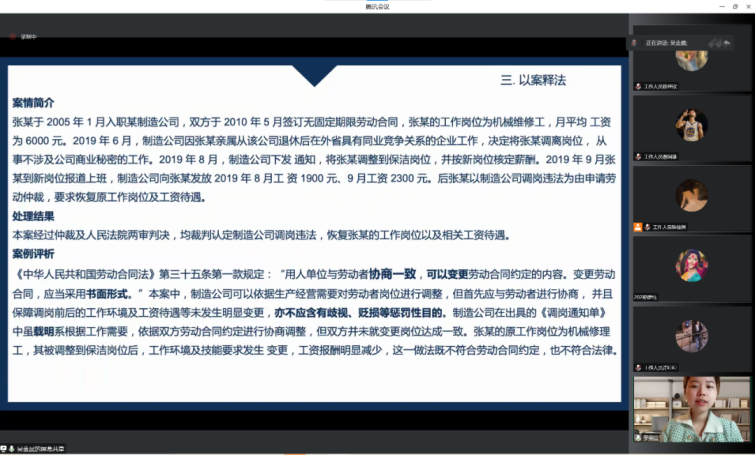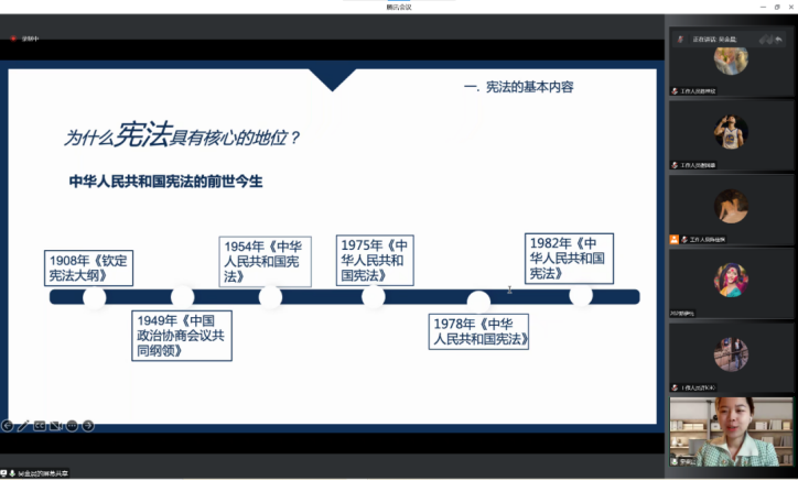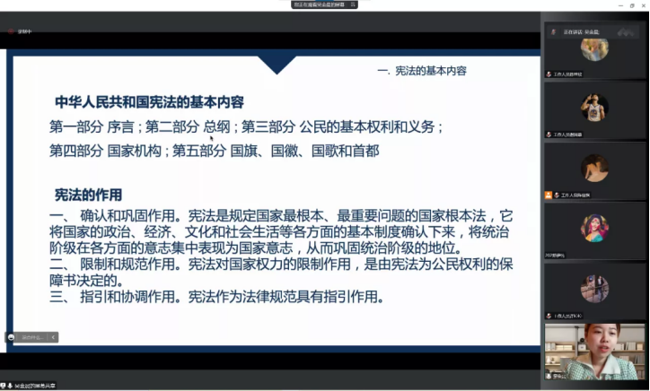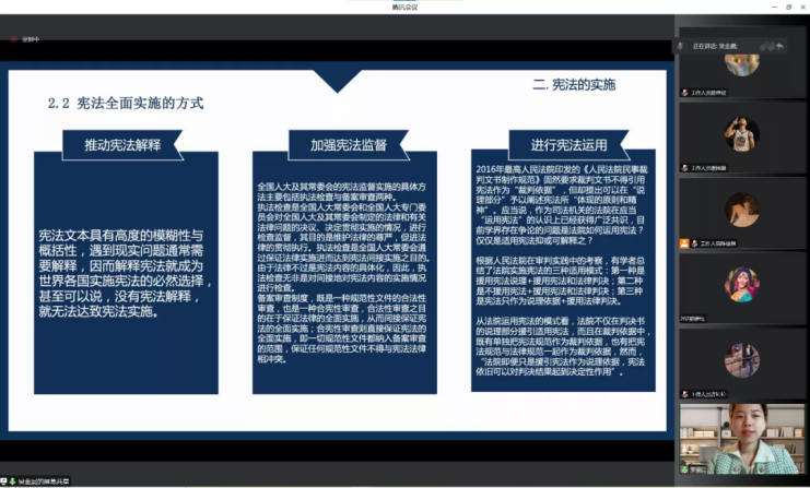 吴金晨老师的讲座主要分为三个部分:宪法基本内容、宪法的实施、以案释法。具体说来涵盖了从宪法的发展历程、宪法重要法条、维护宪法尊严、保障宪法实施、案例分析等。宪法是国家的根本大法,是治国安邦的总章程,具有最高的法律地位、法律权威、法律效力。吴老师重点阐述了宪法的定义、宪法修改的意义、尊崇宪法与践行法治等方面内容,生动讲解了学习宪法的重要意义和作用。同时,她将法律知识和大学生常见法律问题紧密结合,把理论宣讲融入青年学生生活实际,帮助同学们更具象感知,在学习和工作中增强宪法意识,弘扬宪法精神。吴老师还抓住高校大学生等热点问题讲述案例,以通俗易懂、简单实用的语言解读现实典型案例及法律法条,以案释法、以法论事,为我校学生开展一堂生动的法制课。最后,吴老师表示,学习宪法必须准确把握核心要义,联系实际,加强思考,切实增强学习宣传和贯彻实施宪法的自觉性和坚定性。