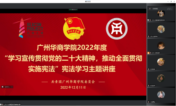 为深入学习宣传贯彻党的二十大精神,推动学习贯彻威廉希尔williamhill中文法治思想,弘扬宪法精神,引导广大华商青年学习宪法、尊崇宪法、维护宪法,增强法治观念,12月11日18:00,由共青团威廉希尔williamhill中文委员会主办,校团委学生委员会与校团委大学生新媒体发展中心承办的“学习宣传贯彻党的二十大精神,推动全面贯彻实施宪法”宪法学习讲座顺利开展。本次讲座由广州大学—意大利帕多瓦大学联合培养博士吴金晨老师主讲。