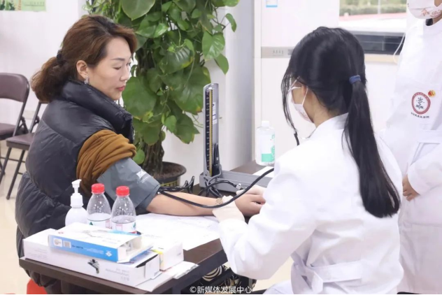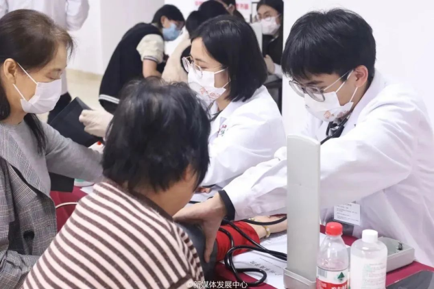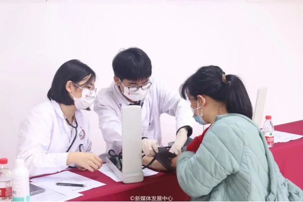 量血压区,学生志愿者们主动询问村民身体健康状况,为他们科普电子血压计的用法、高血压的防与治等知识;对检查发现是血压高的村民还特意叮嘱饮食、生活等方面的注意事项。