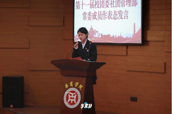 第十一届校团委社团管理部常委团成员朱欣桐作表态发言。她表达了对学校党委领导、团委老师们、各学生社团指导老师、各校级学生组织、各兄弟社团及社管学生骨干的感谢。表示要坚持在学校党委统一领导、学校团委具体指导下贯彻“三个坚定”:第一,坚定思想引领,发挥模范带头作用。深入学习宣传贯彻党的二十大精神,推进党的先进理论社团组织、进社团活动。第二,坚定品牌建设,加强社团管理。积极助力学生社团建设管理工作,打造精品社团活动,创建学生社团品牌,引领校园文化。第三,坚定服务宗旨,实现共同成长。