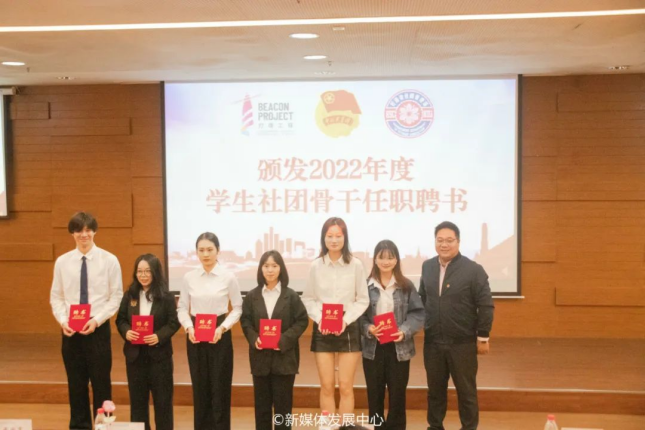 (学校党委宣传部刘苗部长为校团委社团管理部常委团成员颁发聘书)