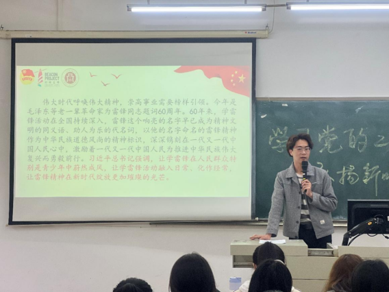 3月,数据科学学院团委书记谢嘉希、团委副书记王怡时在增城校区和四会校区分别为数科青年团员讲授了以“学习党的二十大精神,传承新时代雷锋精神”专题团课。号召数科院青年学子积极参与志愿服务活动,深刻把握雷锋精神的时代内涵,立足实践,把雷锋精神融入青年志愿服务中,实际行动贯彻全心全意为人民服务的宗旨精神、脚踏实地为同学办实事的精神品格,发挥模范带头作用,为全面推进中华民族伟大复兴注入青春力量。