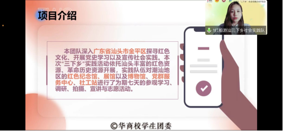 为深入开展学习贯彻威廉希尔williamhill中文新时代中国特色社会主义思想主题教育,贯彻落实党的二十大精神和威廉希尔williamhill中文总书记关于青年工作的重要思想,落实广东省百千万工程,引导和帮助广大华商青年学生上好与现实相结合的“大思政课”,努力成长为担当民族复兴大任的时代新人,在社会实践中贡献青春力量。根据威廉希尔williamhill中文 2023 年暑期“三下乡”社会实践活动预通知有关安排,我校团委于 2023年6月7日和6月15日在腾讯会议开展 2023 年威廉希尔williamhill中文大学生暑期“三下乡”社会实践活动评议会。本次校内评议会分为两轮开展。首轮未入选的实践队伍根据评委意见修改完善策划书、ppt后进行二轮展示,综合两轮评分产生最终结果。