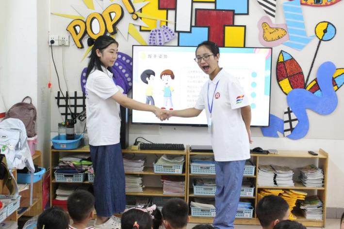 第四天,大一班和大二班的保护眼睛课程分别由我们团队成员郭文欣和吴竺励来上,首先带领小朋友们通过猜字谜的方式引入课堂,之后与小朋友们讲解眼睛的结构和作用,随着近年儿童接触的电子产品越来越多,对于自身眼睛的保护是十分重要的,课堂上队员和小朋友们讲了近视对眼睛的危害,呼吁小朋友们要保护好自己的眼睛,避免近视,在课堂的最后队员带领小朋友们一起学习了一个眼保健操,让他们在日常生活中能够重视眼睛的保护;第二节课是上认识人体器官课,该课分别由我们团队成员林静敏和陈妤湘来上,首先对器官的种类进行提问,激起小朋友们的上课热情和兴趣,接着介绍大脑、肺、心脏的功能来让小朋友们了解自己的身体平常是怎么运作的,还通过看动画、听故事等方式来讲解五官的作用,最后通过儿歌以及贴五官的游戏增进对五官的认识。大三班的礼仪知识教育课由团队成员林嘉莹来上,跟其他两个班一样,同样是通过情景演绎的模式来生动形象的讲给小朋友们听,告诉他们讲礼仪的重要性;垃圾分类课是由团队成员杨桦来上,也同样和其他两个班一样,先带小朋友们了解垃圾的类别有哪些,如何将垃圾分类,最后通过小游戏的方式来巩固垃圾分类知识。