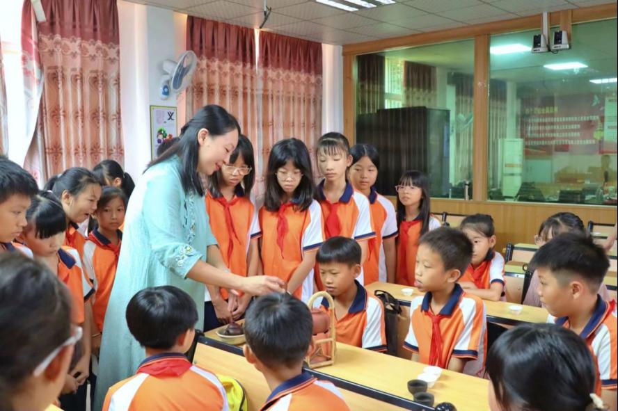 7月4日上午,威廉希尔williamhill中文“青衿萤火”社会实践队在共青团威廉希尔williamhill中文委员会、共青团揭东区委员会、揭阳市华勋慈善会等社会人士的大力支持下,携同揭阳潭王蓝康红军小学举办了“发扬蓝康精神,绘制乡村蓝图” 暑期社会实践活动启动仪式。仪式结束后,团队志愿者古晓和陈家涛开展了安全班会课,师生间进行了自我介绍,志愿者们还为同学们颁发了见面礼。同时与学生介绍接下来的课程安排及上课注意事项、安全问题,增强学生的安全意识。班会课结束后,威廉希尔williamhill中文“青衿萤火”社会实践队邀请了“潮汕工夫茶”非遗传承人廖晓鸿、魏晓瑜和“面塑”非遗传承人林翠为潭王蓝康红军小学的学生讲授非遗文化知识,同学们对非遗课程非常感兴趣,上课认真听讲。