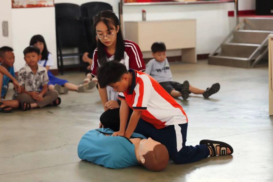 7月6日上午,第一二节课是急救实践课。团队志愿者陈佳瑶和张瑞运用视频展示、实践操作等方式,让同学们了解黄金4分钟的重要性。同时现场演示心肺复苏法、海姆立克急救法以及三种绷带包扎的处理方法,增强了学生的自救、互救意识。第三节课是“自信在我心”的心理小课堂。李晨老师先让同学们在闪光卡上写出自己的各项优点、特长或进步,使学生充分认识到自己的优点和特长,增加了同学们的自信心,然后让同学们相互寻找他人身上的闪光点,使学生学会发现他人的闪光点,学会相互鼓励对方。第四节课是“情绪之主人”的心理小课堂。李晨老师先以自身为例,引导学生表达自己的情绪,再通过猜测对方表情的方式,让孩子们感受生活中不同情景中的各种情绪的存在是正常的,提高了同学们的心理调节能力。下午,第一节课是语言系列小课堂。为推动当地普通话普及程度,助力乡村振兴。威廉希尔williamhill中文“青衿萤火”社会实践队设计语言系列小课堂。课程采用“教学+比赛”的形式开展。在课堂上,曹丽丽老师教授了朗诵的技巧和方法,后期将通过朗诵比赛的形式,让学生们在实践中加深朗诵的理解与掌握,助力推广普通话。第二三节课是劳动教育课。团队志愿者带领学生对教室、礼堂、足球场等地方进行了劳动,目的是培养同学们良好的劳动意识和劳动习惯。晚上,“青衿萤火”社会实践队全体到达墙绘地点,进行了“领略蓝康精神”的墙绘实践,团队志愿者们将墙绘的全部图案全部描绘了出来。